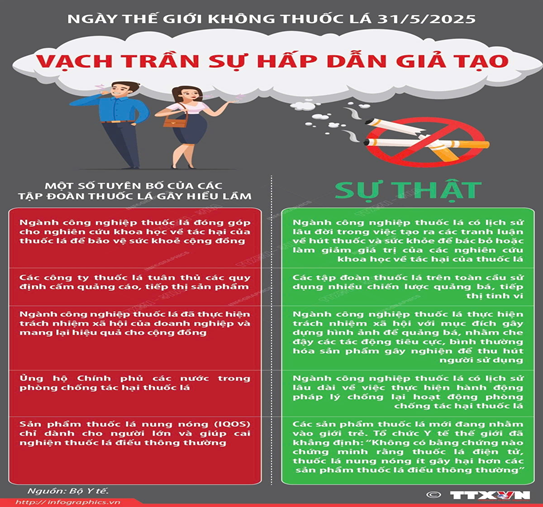 Sử dụng thuốc lá là một trong những mối đe dọa sức khỏe cộng đồng lớn nhất mà thế giới đã và đang phải đối mặt. Năm 2025, Tổ chức Y tế thế giới chọn chủ đề “vạch trần sự hấp dẫn giả tạo” nhằm phơi bày chiến thuật của các tập đoàn thuốc lá trên thế giới trong việc quảng cáo sai sự thật, gây hiểu lầm thuốc lá không có hại để mở rộng thị trường tiêu thụ, đặc biệt là trong giới trẻ. Tổ chức Y tế thế giới kêu gọi các nước cùng chung tay thực hiện Chiến dịch truyền thông hưởng ứng Ngày Thế giới không thuốc lá 31/5/2025 vì một tương lai khỏe mạnh hơn.