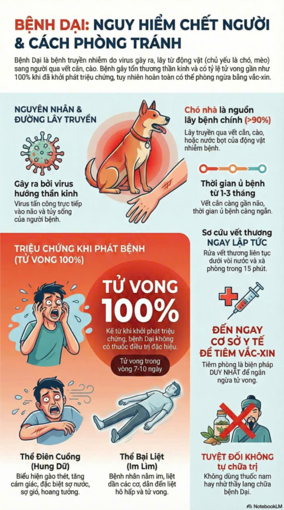 ⚠️ Bệnh Dại là nỗi ám ảnh kinh hoàng, được xếp vào danh sách các bệnh truyền nhiễm nguy hiểm nhất vì tỷ lệ tử vong gần như tuyệt đối (100%) khi đã xuất hiện triệu chứng. Dù có đầy đủ hình ảnh về tác hại khủng khiếp của bệnh, chúng ta vẫn cần nhấn mạnh 3 điều cốt lõi: