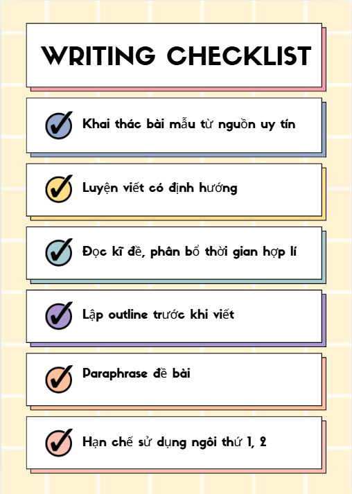 Trong hành trình chinh phục kỳ thi IELTS, đặc biệt là phần Writing Task 2, không ít thí sinh coi đây là một thử thách đầy áp lực. Sự gò bó về thời gian, nỗi lo thiếu ý tưởng hay sai sót ngữ pháp thường khiến nhiều người cảm thấy căng thẳng. Tuy nhiên, thực tế cho thấy rằng nếu có sự chuẩn bị đúng hướng và phương pháp rèn luyện khoa học, việc đạt điểm cao hoàn toàn nằm trong tầm tay. Một trong những công cụ hữu hiệu giúp thí sinh kiểm soát chất lượng bài viết chính là việc sử dụng “checklist” – danh mục kiểm tra mang tính chiến lược, giúp quá trình ôn tập và làm bài thi trở nên chủ động, mạch lạc và hiệu quả hơn.